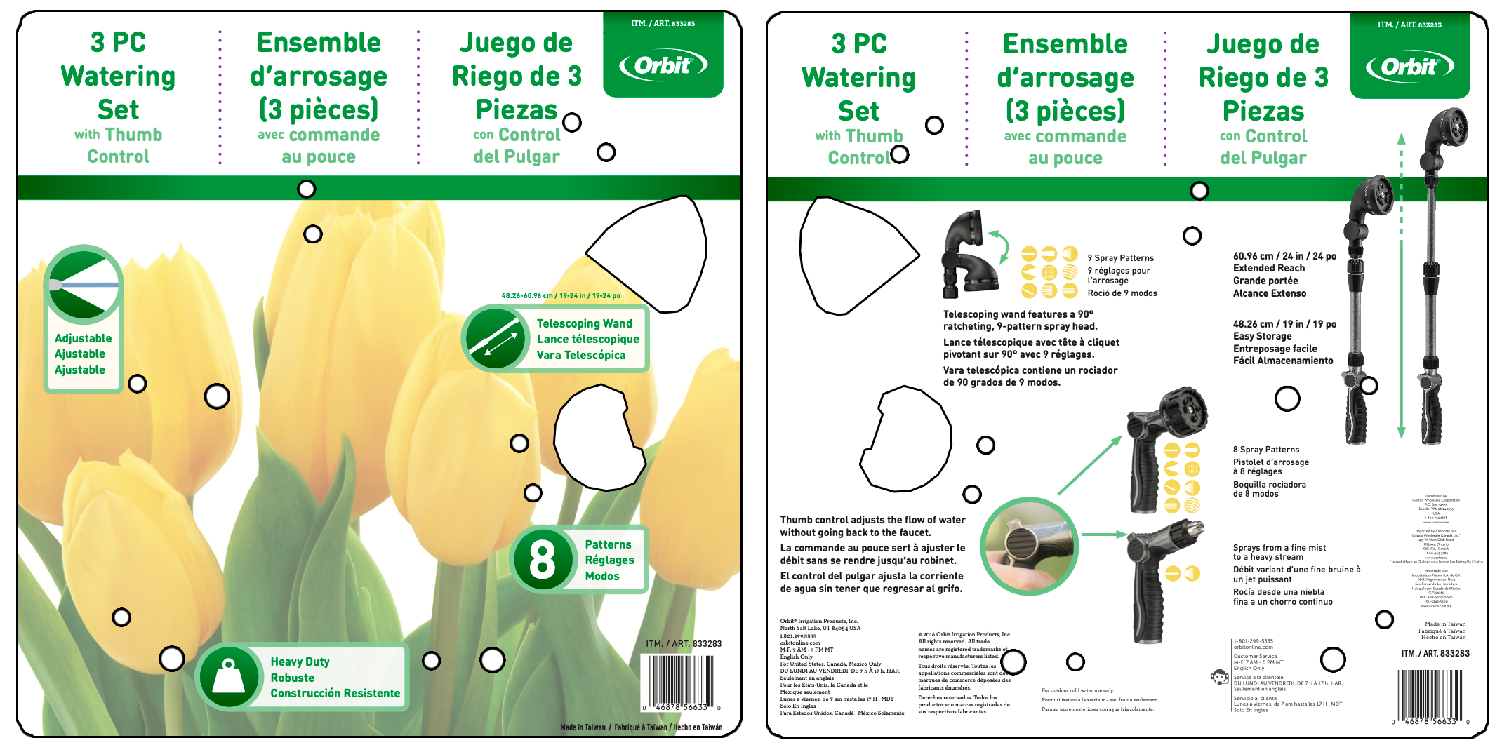Orbit Irrigation, a B2B company that manufactures lawn and garden watering products, needed updated packaging for a nozzle set that was being sold to Costco. I led the design process while working with a Product Line Manager, a Sales Support Specialist, as well as the Sales manager for the Costco account.